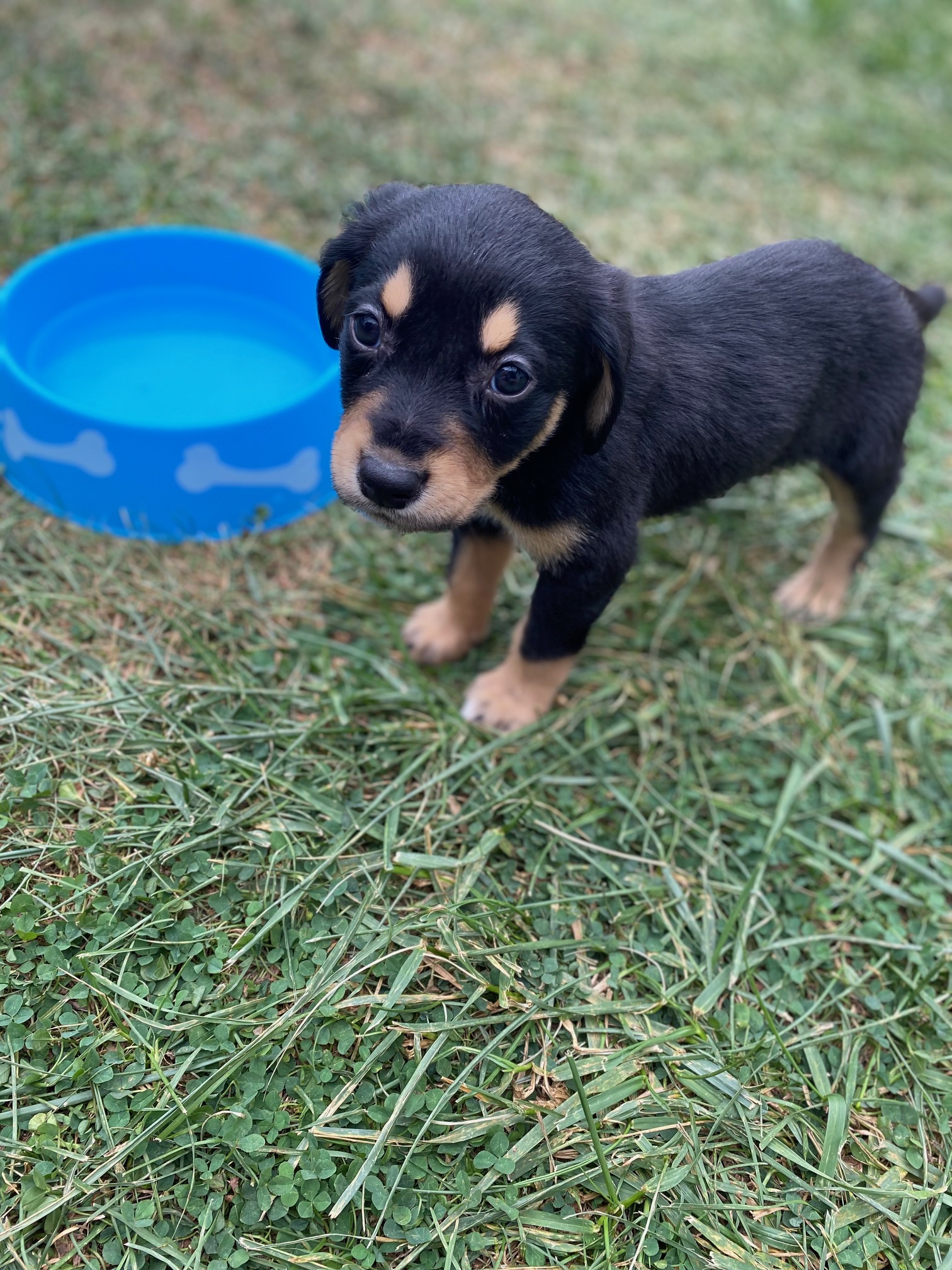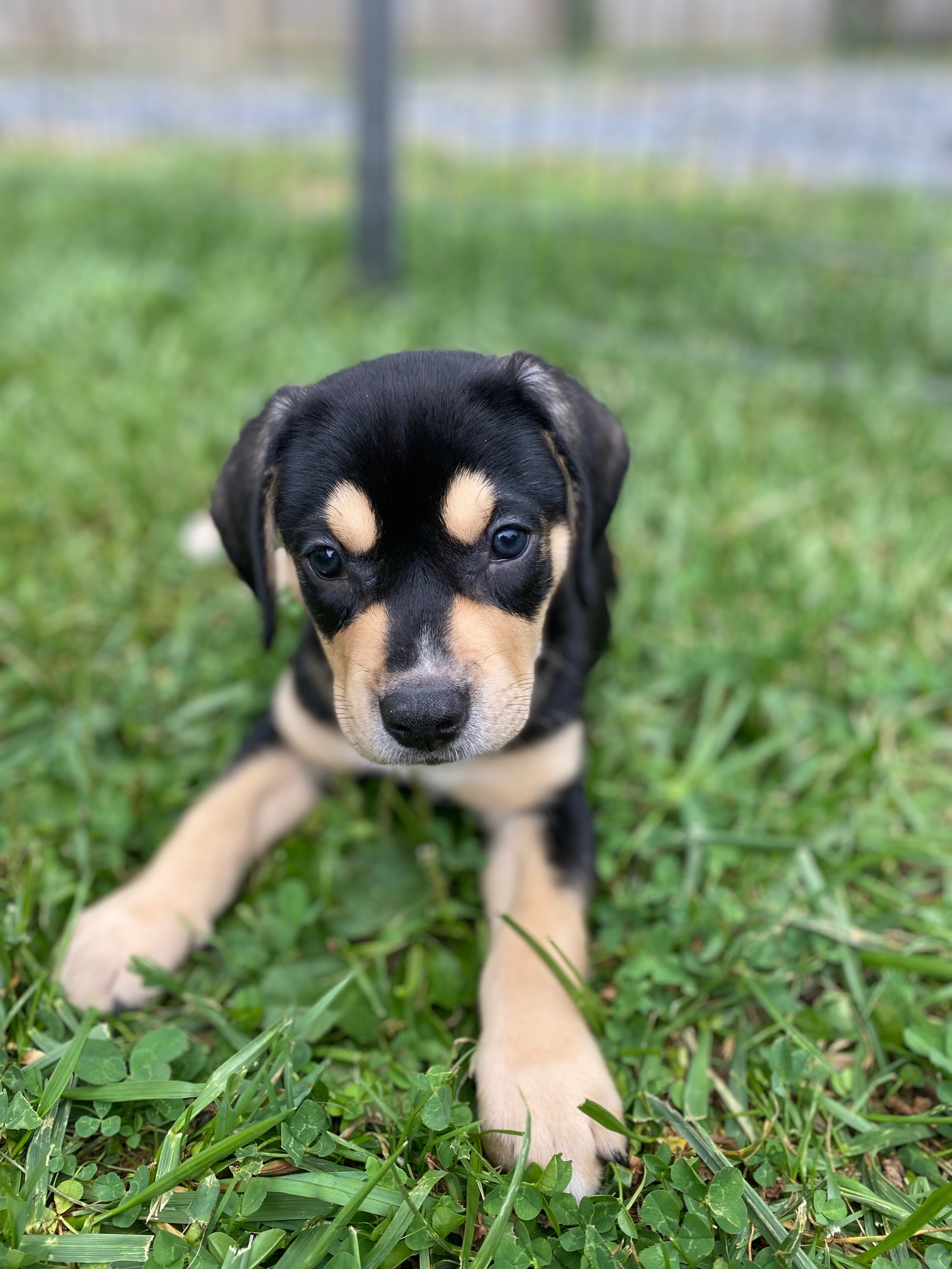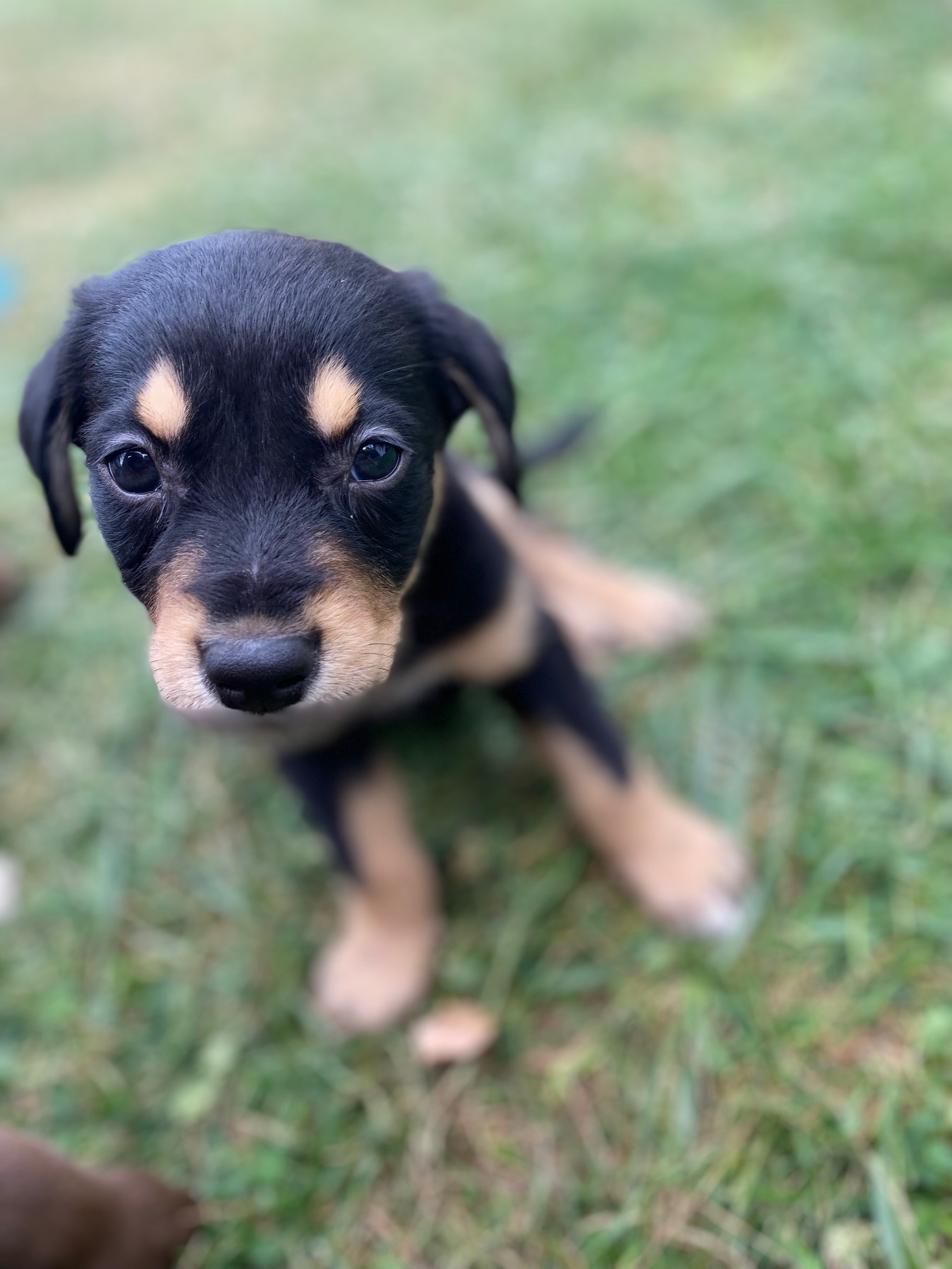 Tart is in the middle in terms of energy for this bunch, but often gets run right over by his larger siblings. He has beautiful markings, much like a rottweiler, but he won’t be a big dog (my guess) as he is just over five pounds at seven weeks of age. His fur is softer and slightly longer than his siblings and he is lighter-boned with a more compact build, as opposed to their elongated builds. It’s always interesting to see the wide variety within one litter of puppies, particularly scrumptious puppies like these! If you’d like to apply to adopt Tart, click here.
