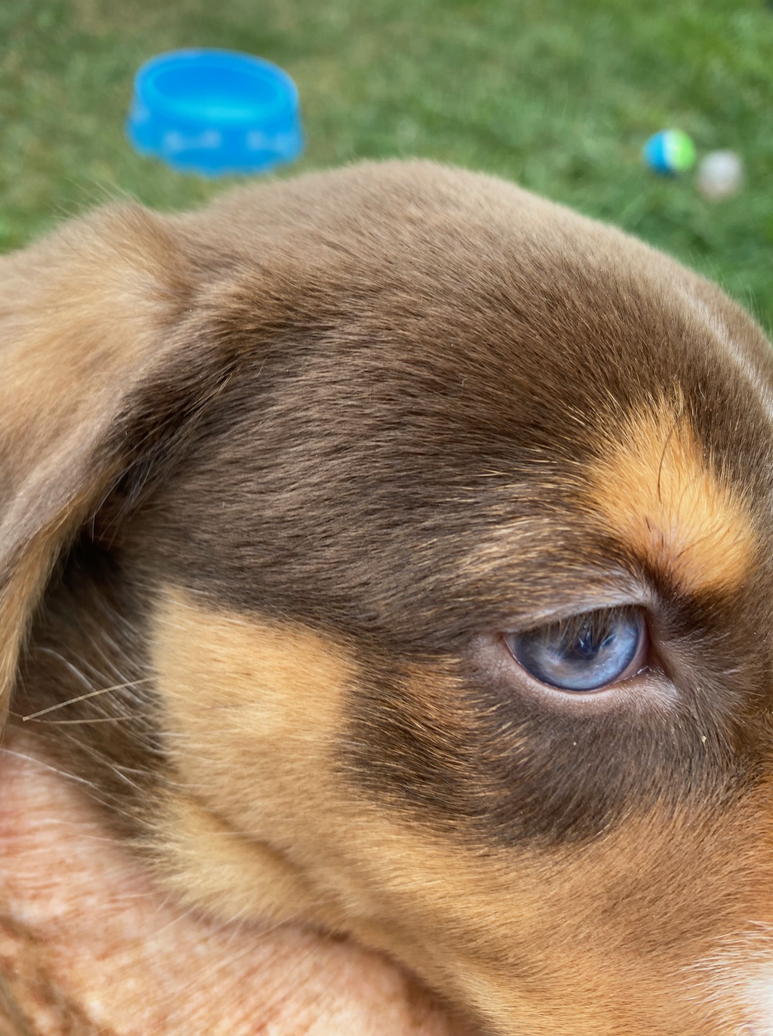 A week ago, a friend asked me what was wrong with Maraschino’s eye. I looked closely at what she was noticing (she was snuggling him close outside in the sunshine) and was shocked to see what looked like cracked ice in the center of his right eye. Just faint lines you wouldn’t (and I didn’t) notice from a distance or inside in the chaos of those first few weeks in the puppy room.