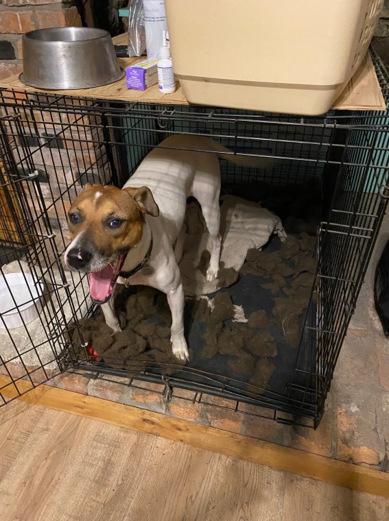 I cover her crate completely with a dark, heavy blanket at night, to at least shield her from the flashes of lightning, and she seems no worse for wear considering the storms that have come through. At least she doesn’t tear up her bed….