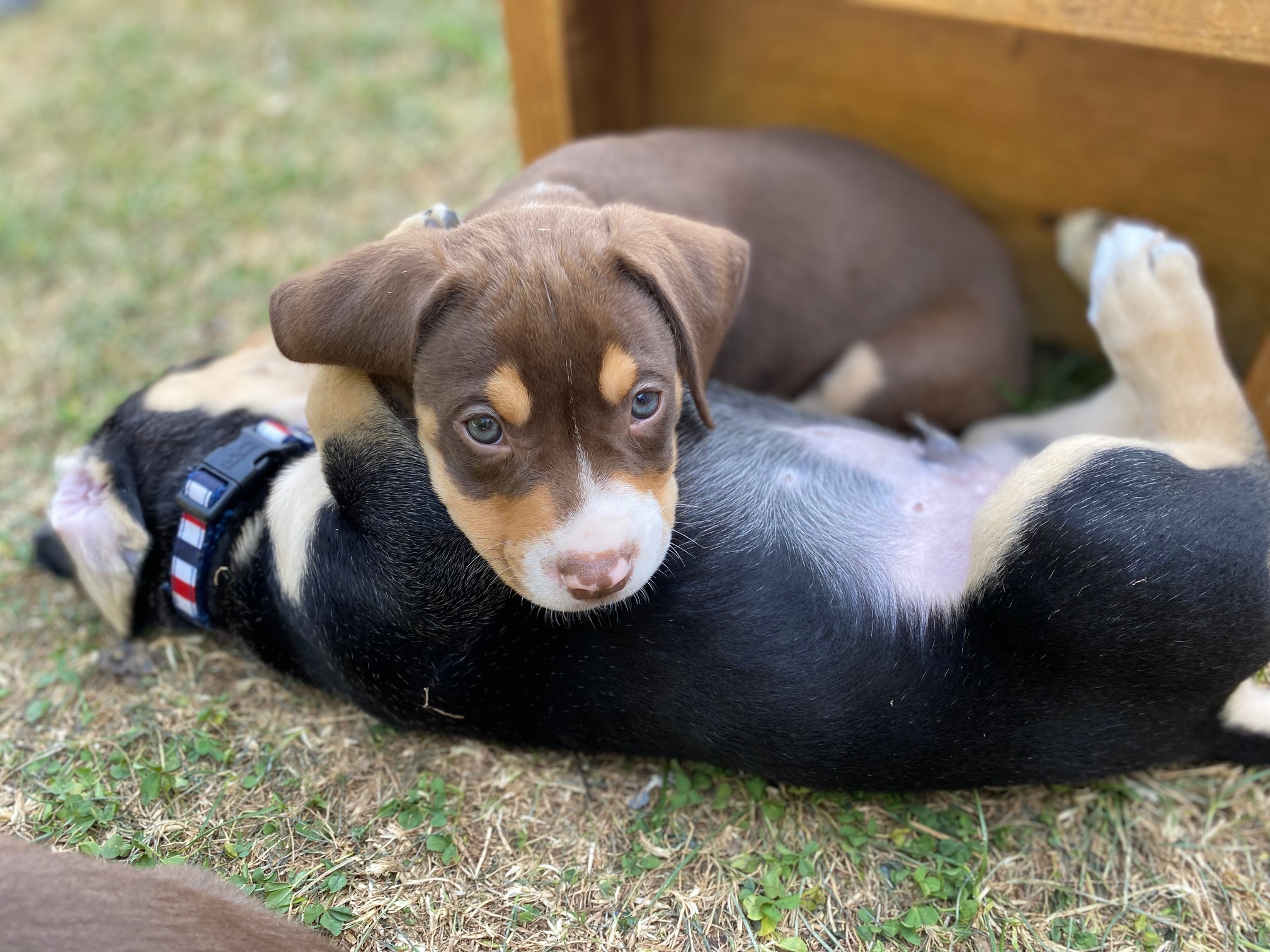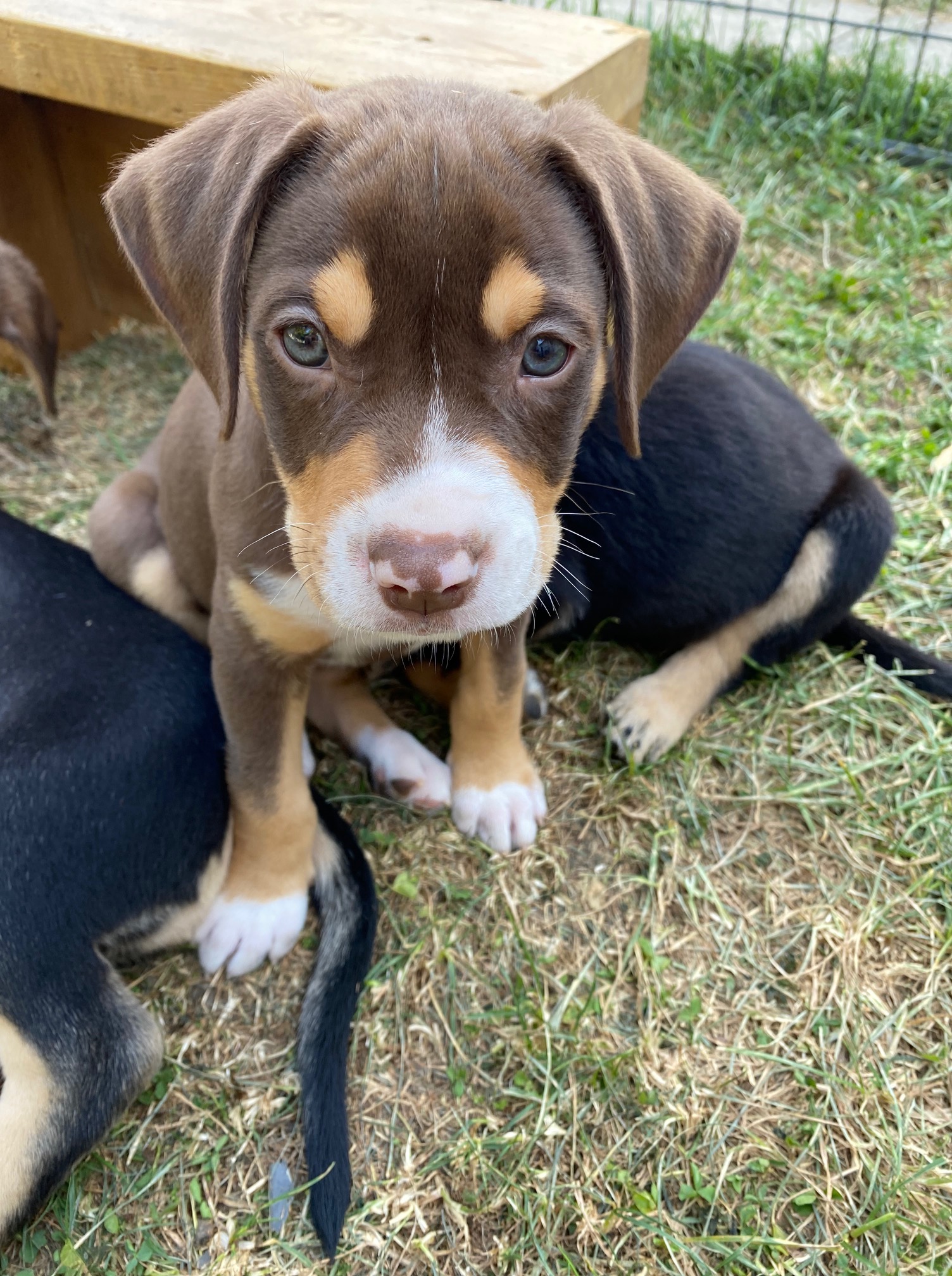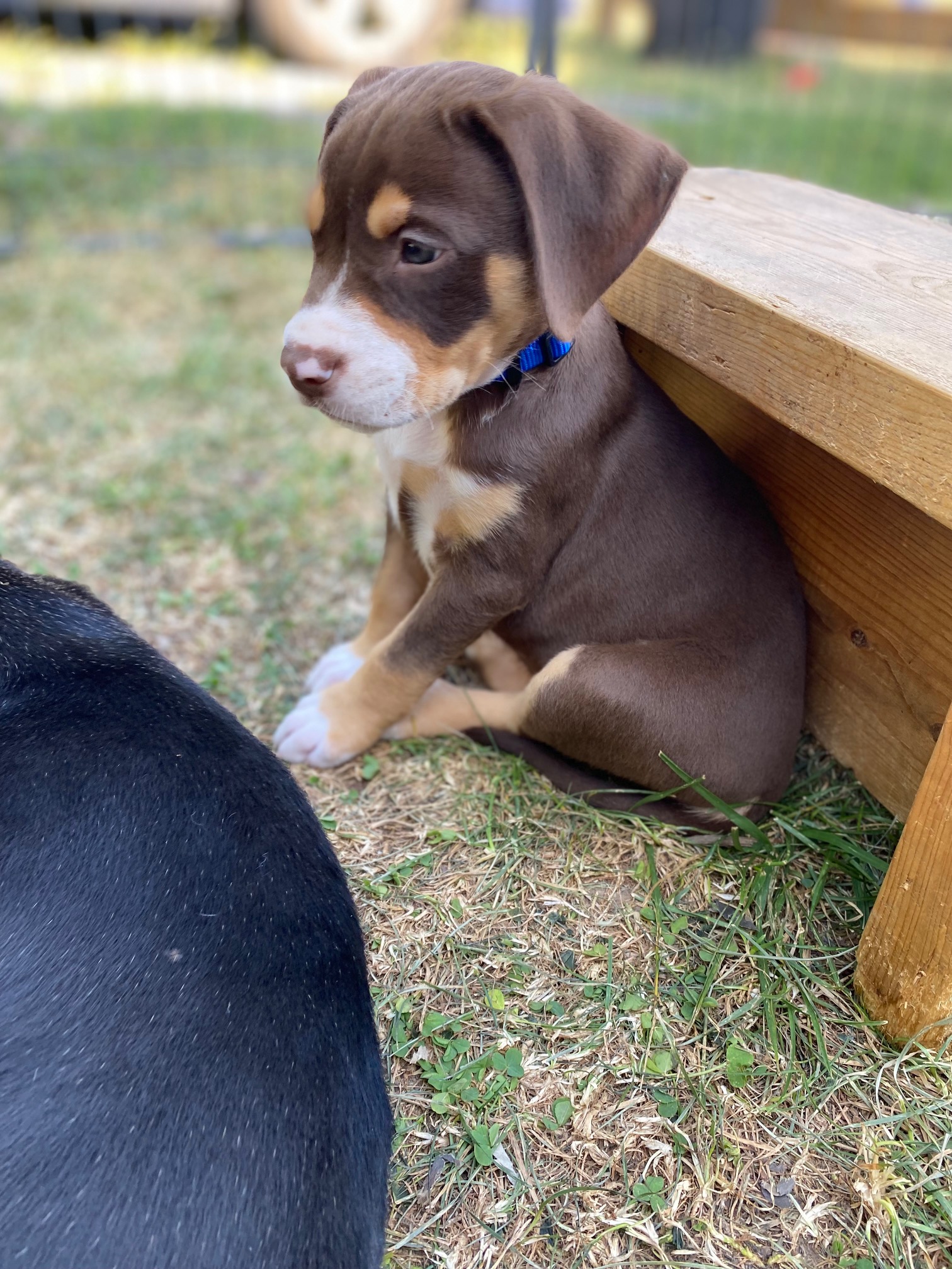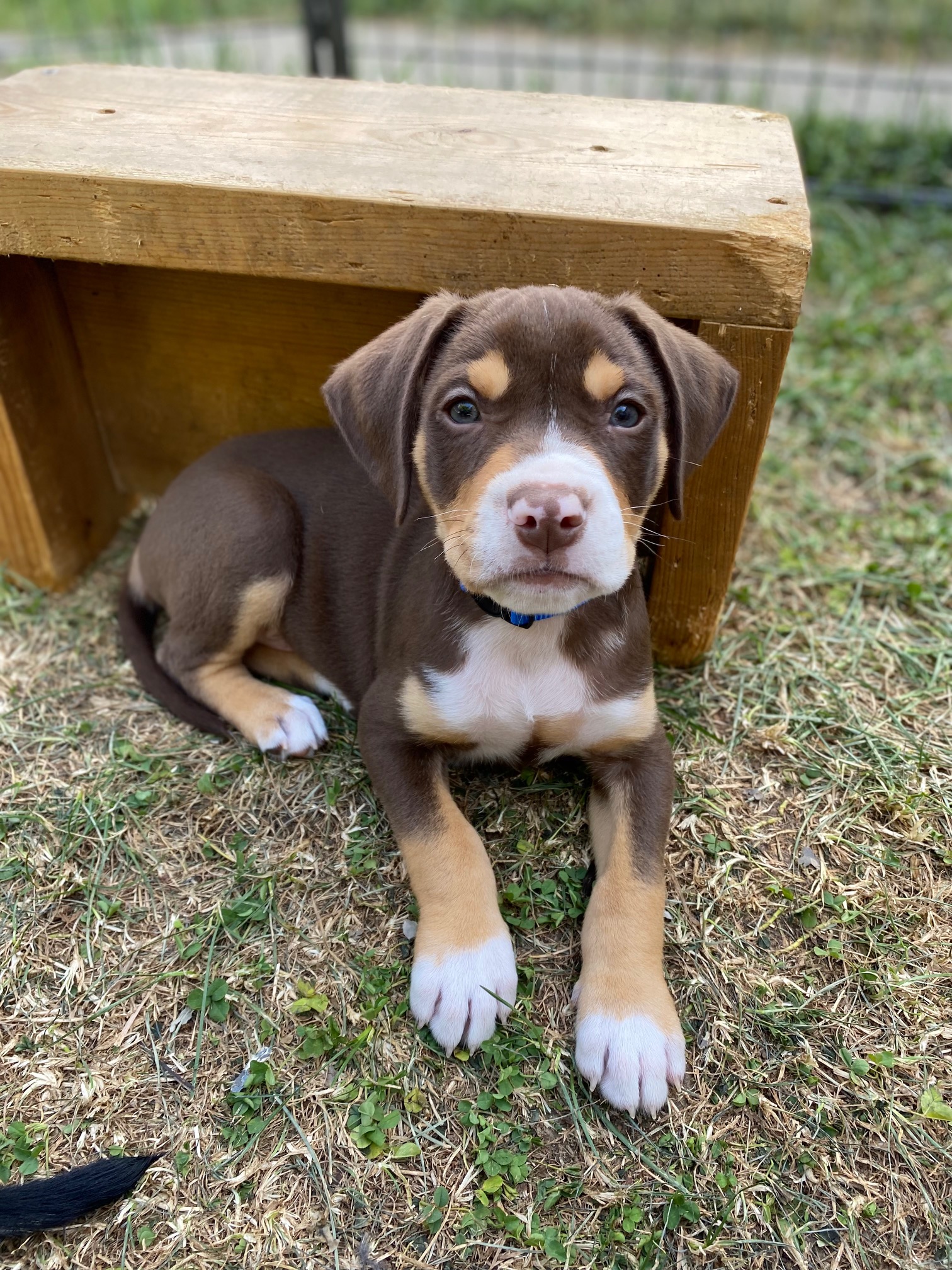 Ranier is one of the small, but mighty pups (Tart is the other). He is probably not going to grow up to be a large dog. My guess is 40 pounds tops. (No one say anything about my track record on these guestimates, please.) He is super smart and very agile – the only one to figure out how to climb out of the puppy pen fence when the gate is open (the bottom lip of the gate is well above their heads, but he’s a determined soul). He’s also mostly mastered the sit command. He loves to sit in your lap and gaze into your eyes. He has THE best nose. He’s a go-getter, always the first to check out anything new in the pen, always the one to notice if I didn’t latch the gate. He’s also a collector, carrying all the toys he finds in the pen and placing them in the small crate we have in there. Basically, he’s a lovable, industrious, clever little guy.