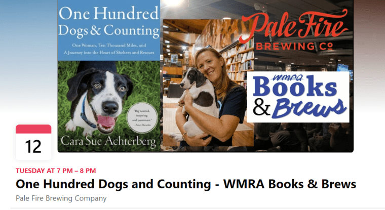 If you’re in the Shenandoah Valley, or anywhere near Harrisonburg, VA, come out and join me at Pale Fire Brewing Company this Tuesday September 12 at 7pm for Books & Brews. I’ll be talking about my book, One Hundred Dogs and Counting: One Woman, Ten Thousand Miles, and a Journey Into the Heart of Shelters and Rescues. There will (hopefully) be adoptable dogs there from Rockingham County Animal Shelter, books for sale, plus, of course, yummy beer and pizza also for sale (my favorite is the Negative Boogie DIPA!).
