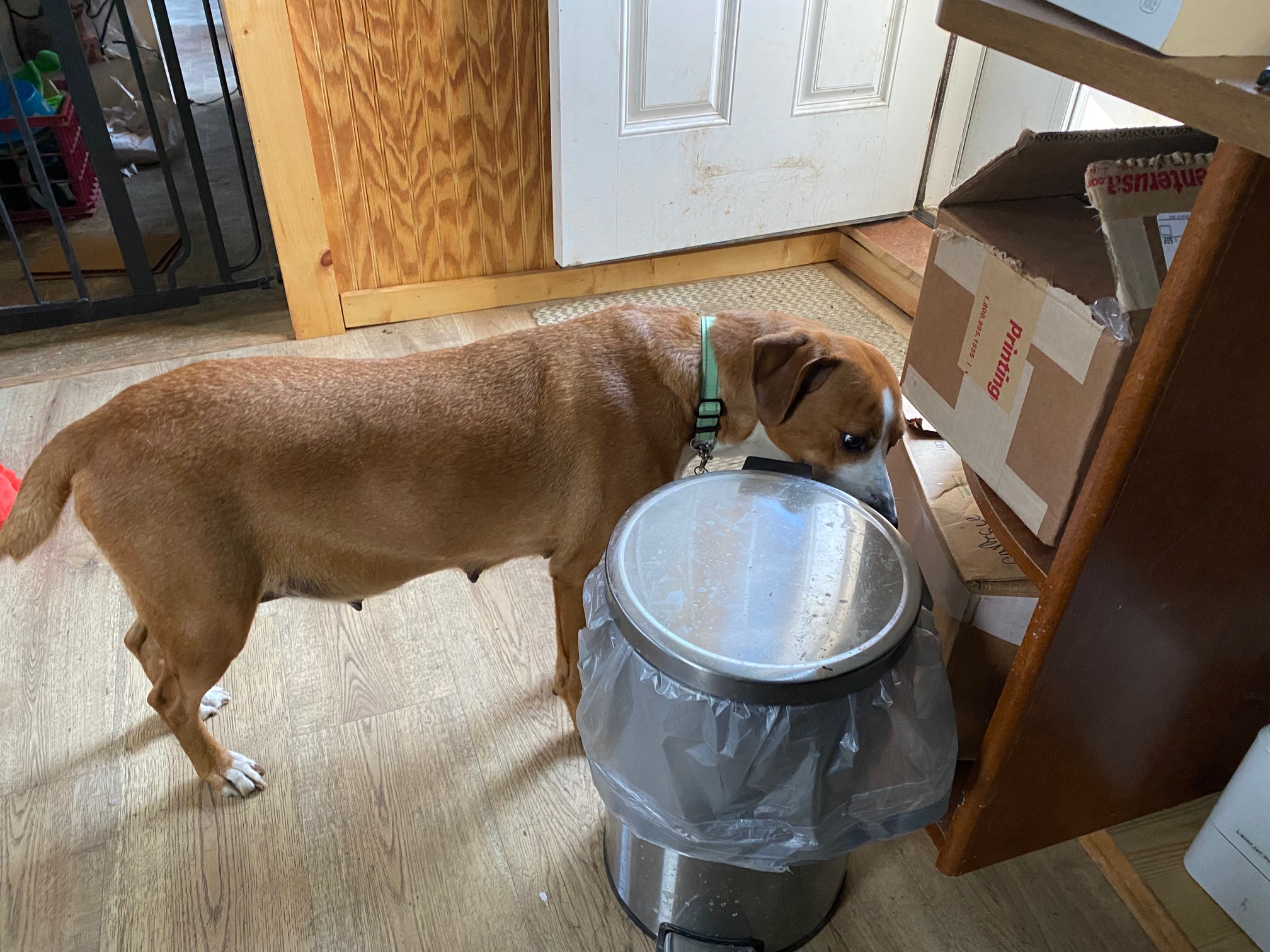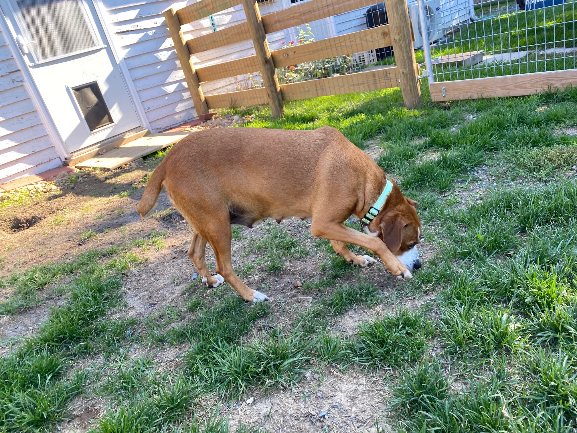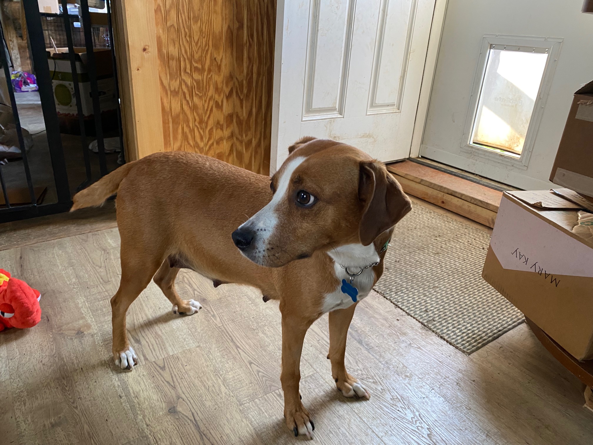 So, Sugar is here, settling in. She’s yet to eat anything I’ve offered (other than treats). She’s quiet and already my shadow. The thing that has brought her the most joy, so far, is discovering my recycling box. She LOVES to chew paper. Here is a homework-eating dog in the making. She is curious about my dogs, touching noses through the fence, but more focused on me and where I am.