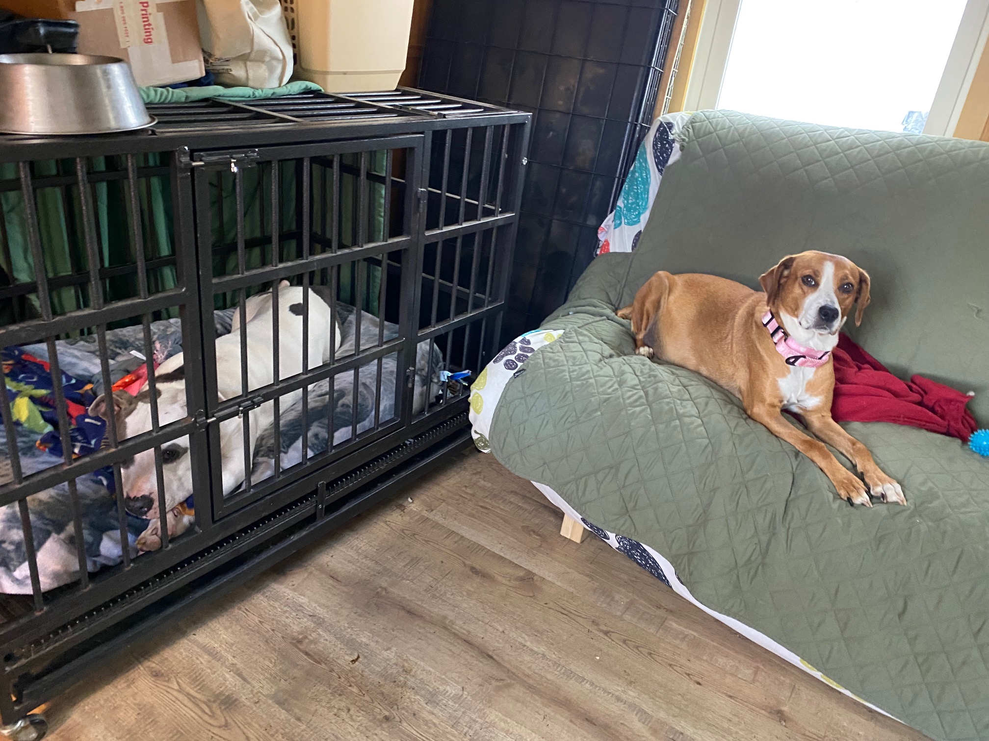 Introducing new dogs takes time. My normal plan is to allow them to live together communally in crates for a few days, with one loose at a time. In foster lingo, this is called, “Crate and Rotate”. Every hour, one pup is put away and another allowed out.