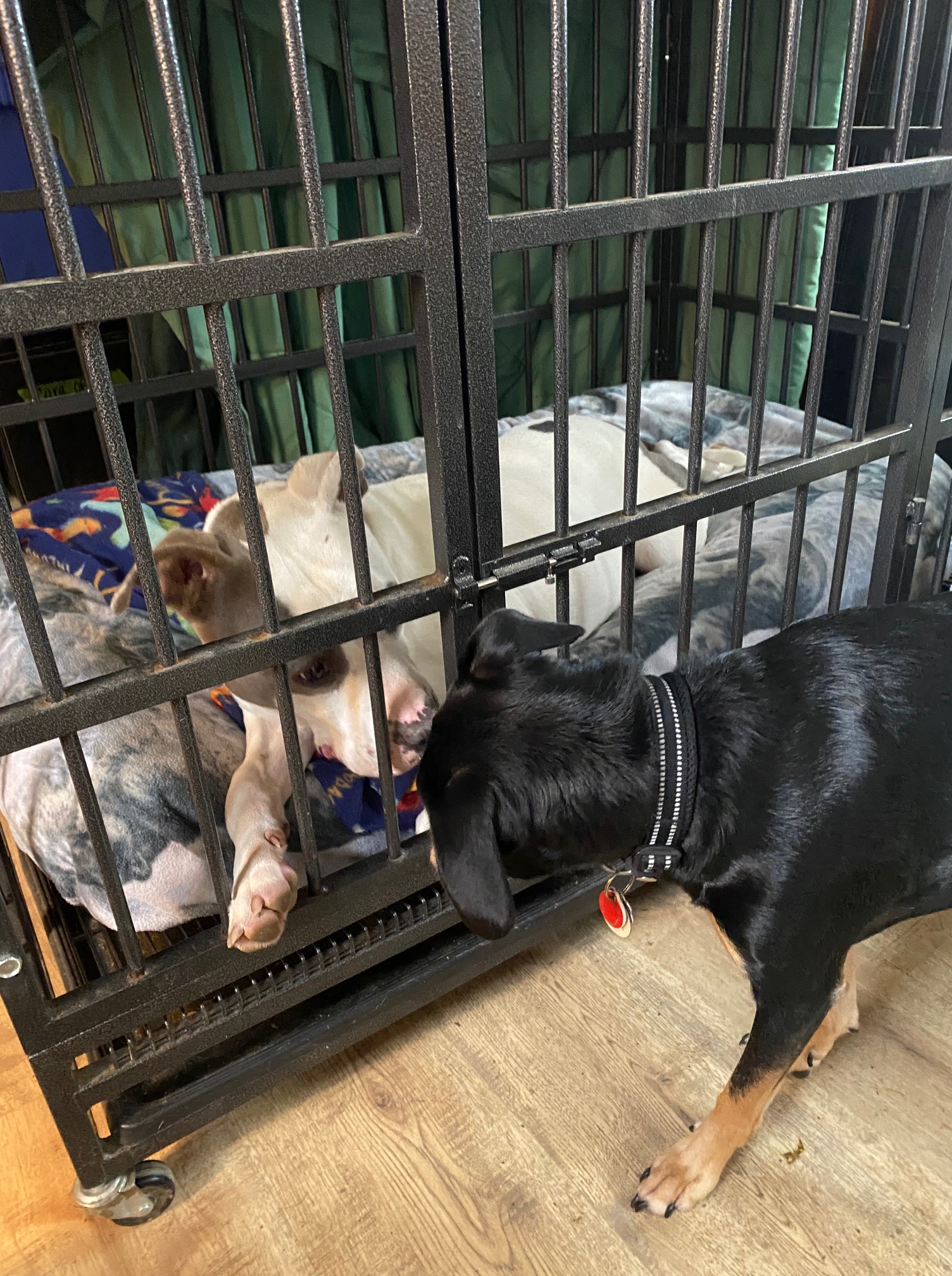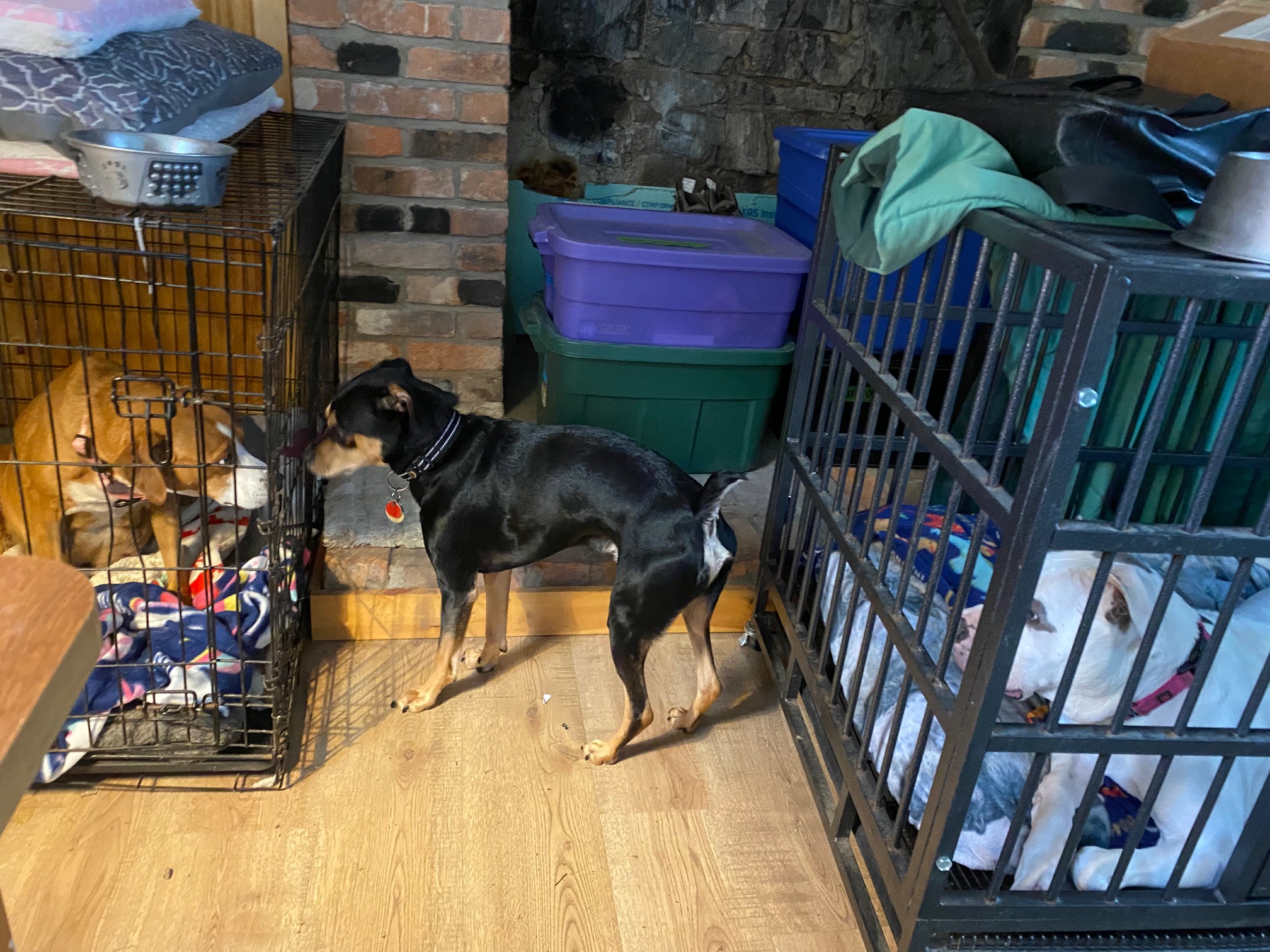 How quickly we progress from ‘crate and rotate’ to ‘play time together’ depends on the dogs. Meanwhile, I don’t need an apple watch to tell me I’ve been sitting too long, I’m up every hour to rotate crates.