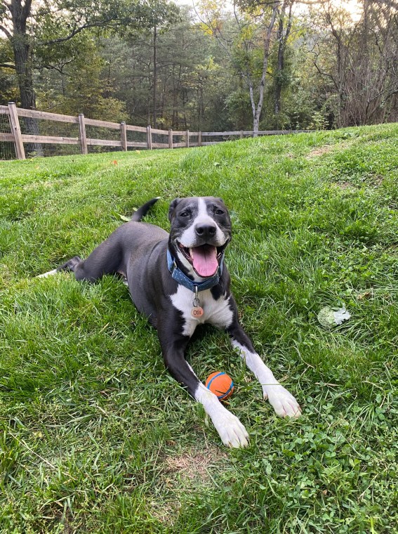 Marly is sweet girl ready to find the home of her dreams – someone to cuddle her, take her on long walks to explore all the smells, and give her plenty of toys to chew. She is seven years old and forty pounds. Her breed is a big question mark, but she has soft, fawn-colored fur, a curly tail, and one blue eye. She is housebroken, crate-trained, and walking well on a leash (with a front-leading harness). She loves everyone she meets, does great on car rides, and is eager for new adventures. She doesn’t have the patience for a home with children (she’s a mature lady a little set in her ways). She has a real desire to chase squirrels and follow scents, so she might do better in a home without cats.