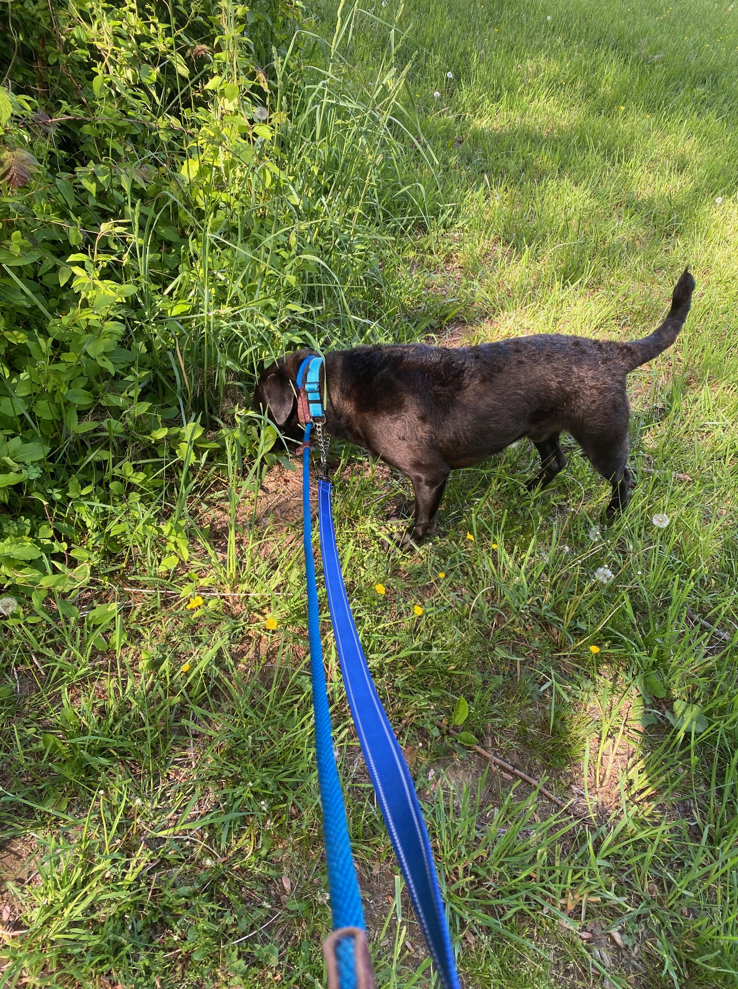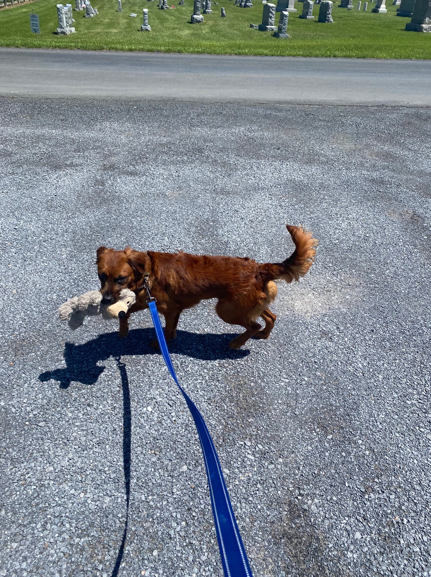 Now that there is a little bit more time in my day for them, we have been venturing further – taking walks down our quiet road. They’ve grown accustomed to passing cars, although big/noisy trucks send them into a panic. Bonnie is finally relaxing a little since I’ve realized that if she can carry one of her stuffed animals with her she is calmer. Now she doesn’t just bounce in place or whirl in circles when I put a leash on.