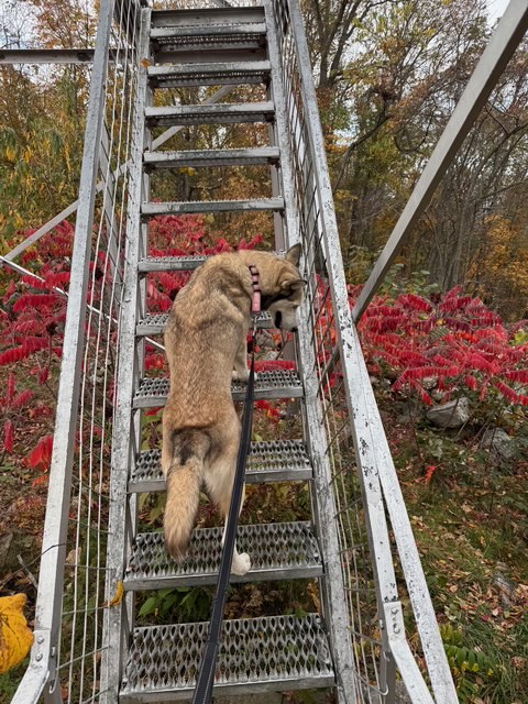 Leche loves riding in the car. She eagerly jumps right in and even when we drove her up to Woodstock Tower (a long, swithback-filled, mostly dirt road to the top of the Massanutten mountains overlooking our town), she was fine and bounded out of the car ready for adventure when we arrived. She even wanted to climb the tower despite the narrow metal stairs. I didn’t let her, mostly because those stairs make me nervous and I was worried, in her eagerness to follow my son and husband up, she’d pull me over.
