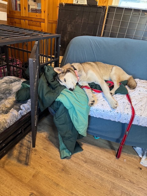 That said, after eleven days of routine and regular crating and walks, she is settling. Her fun personality is sparkling, and she is happy. She jumps right into her crate for treats, and just as happily bounds out for walks. In between, she explores all the toys Diamond leaves strewn about, sniffs around the fenced foster yard, or relaxes on the floor beside me, and occasionally on the futon.