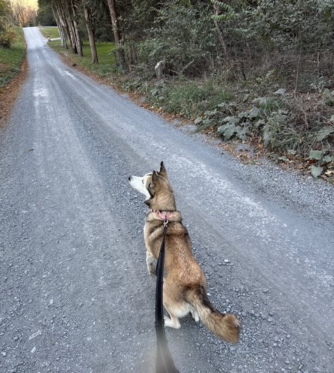 At some point, she likely became a stray. I guess that because she is INSANELY hungry all the time and knows to look in containers (i.e. trash cans) for food and is always scavenging along the road when we walk. She’s cataloged where every treat bag/container is in my office (or where they are now that I had to move every one of them to higher ground to discourage her persistent searching).