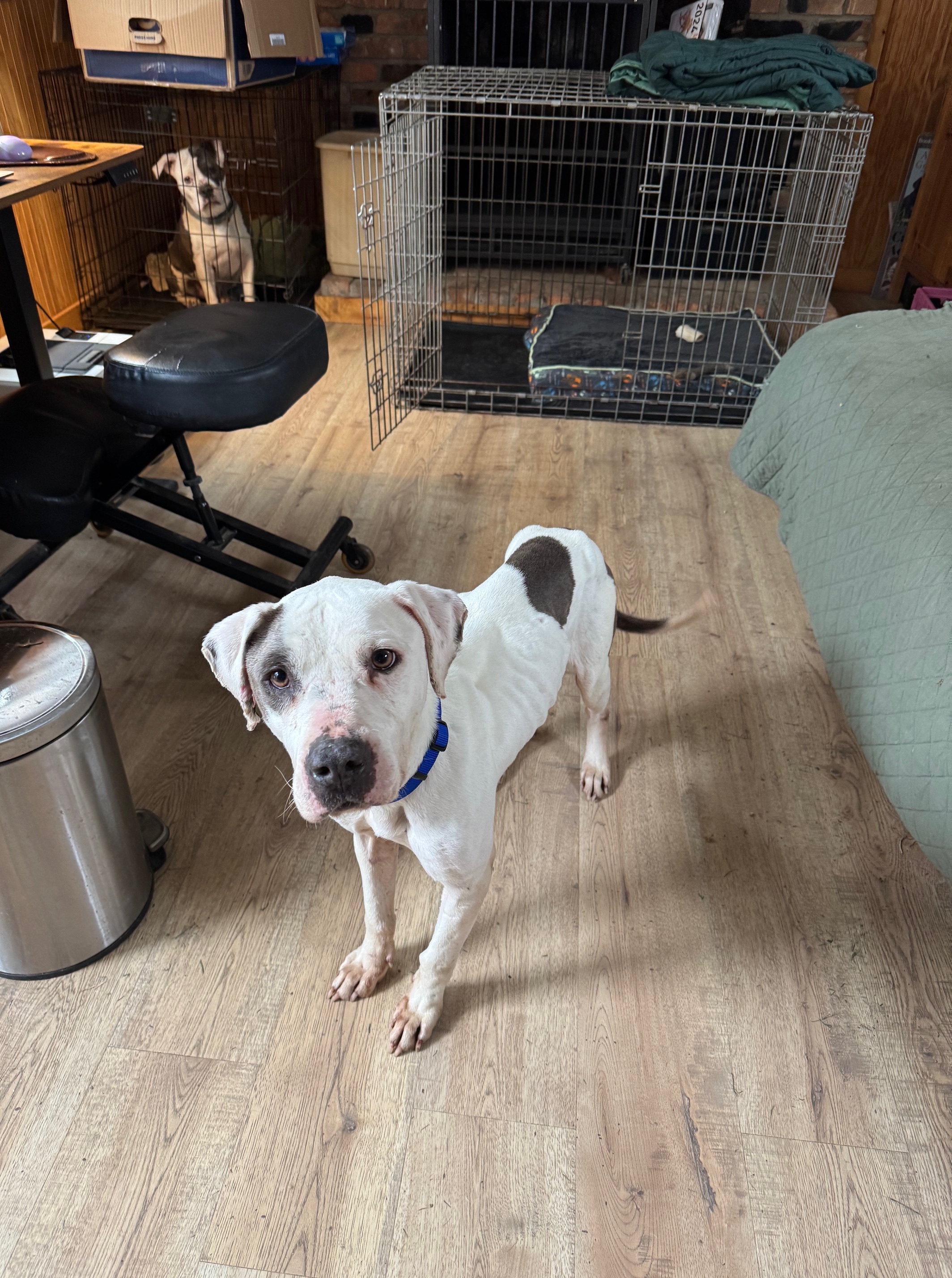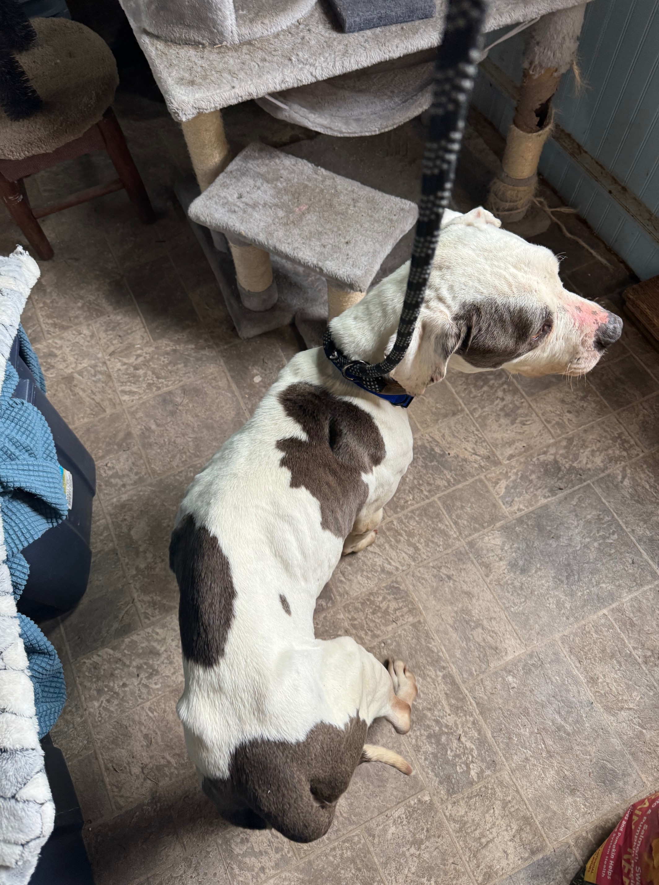 He makes a nice matching set with Diamond, my other foster. He is the same size as her but weighs about 25 pounds less. He is quite literally a walking skeleton. It’s easy to feel all of his bones.