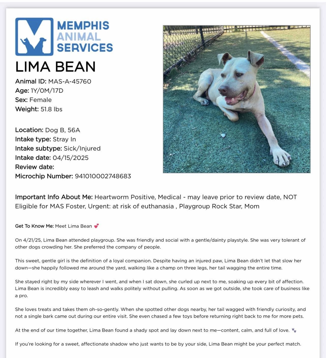 It started with Dani, who was out of time at Memphis Animal Services. Young, beautiful, dog-friendly, people-loving, playful β it was crazy that such a great dog would die because of space (and heartworm status).