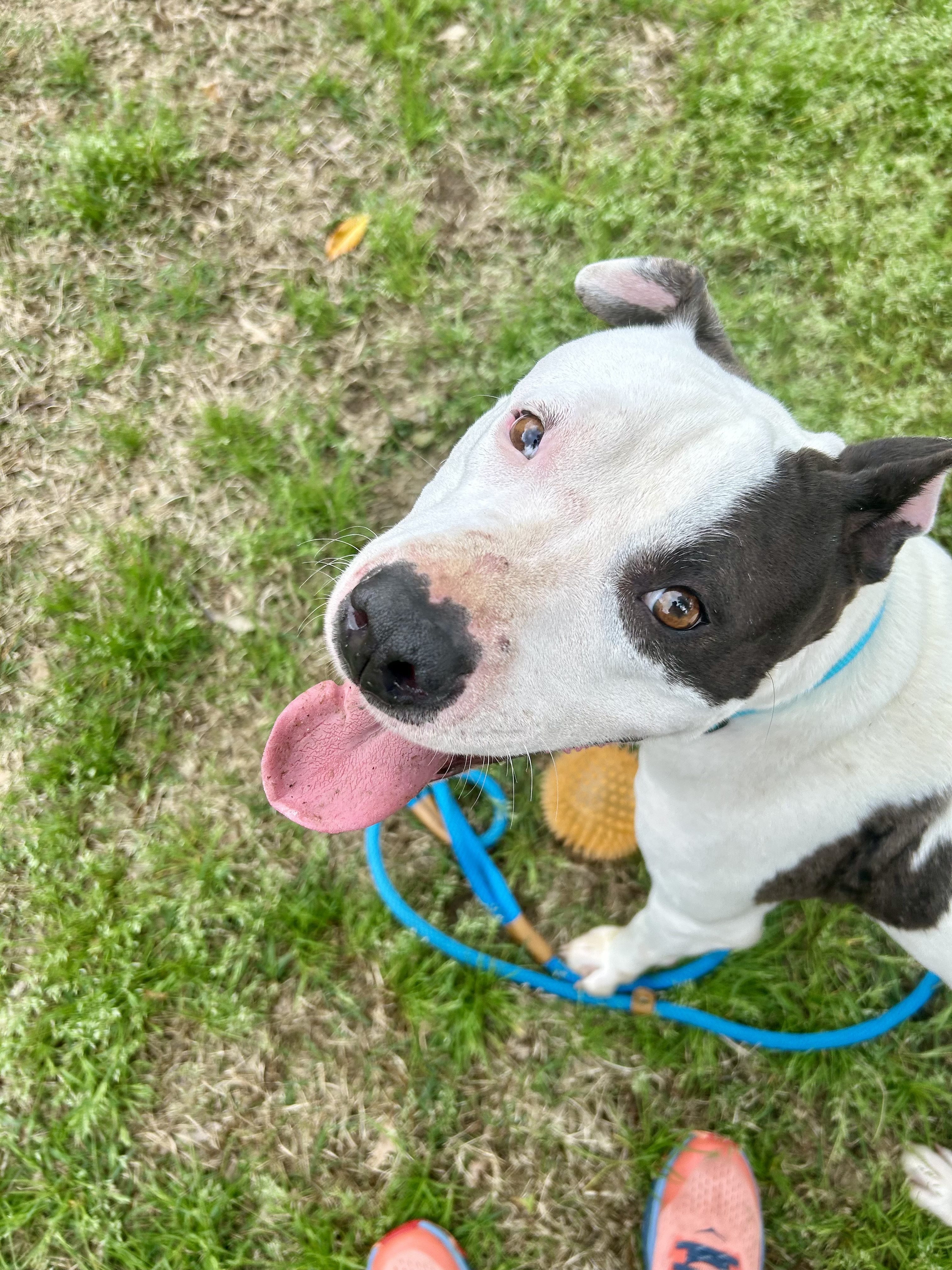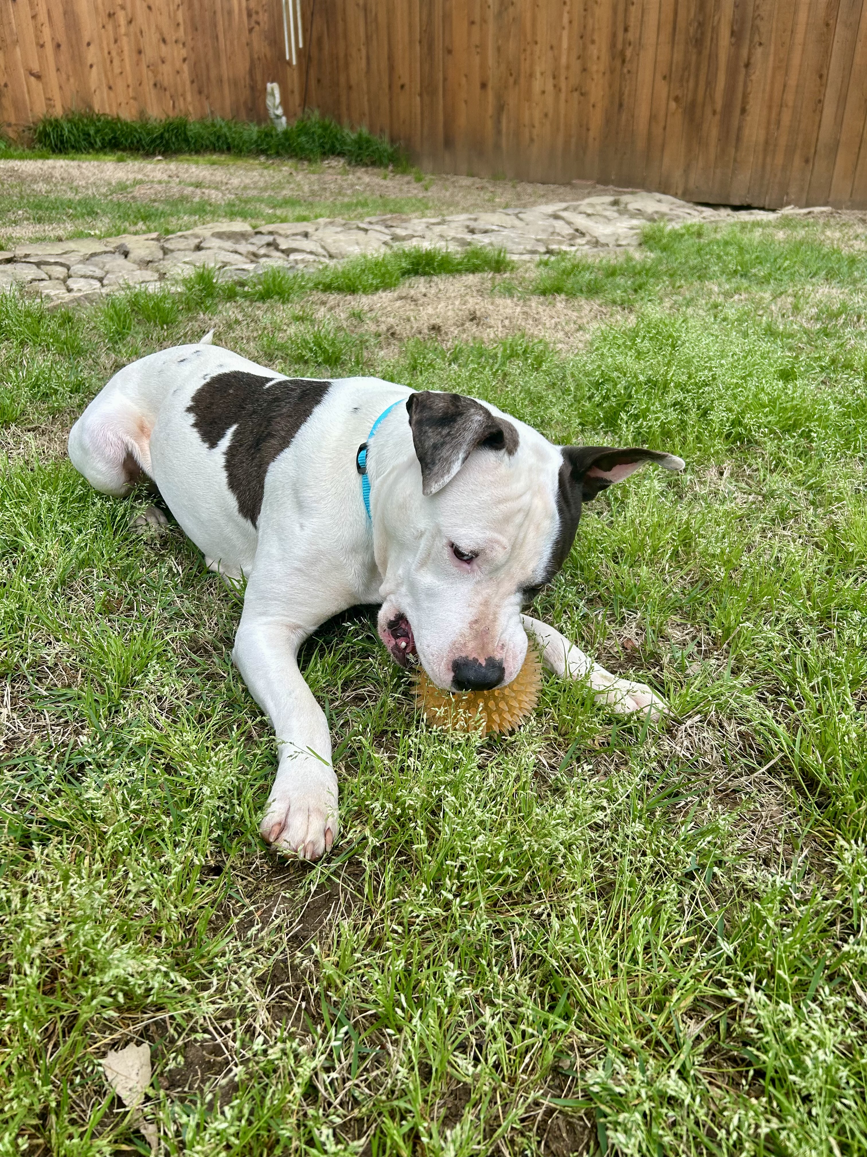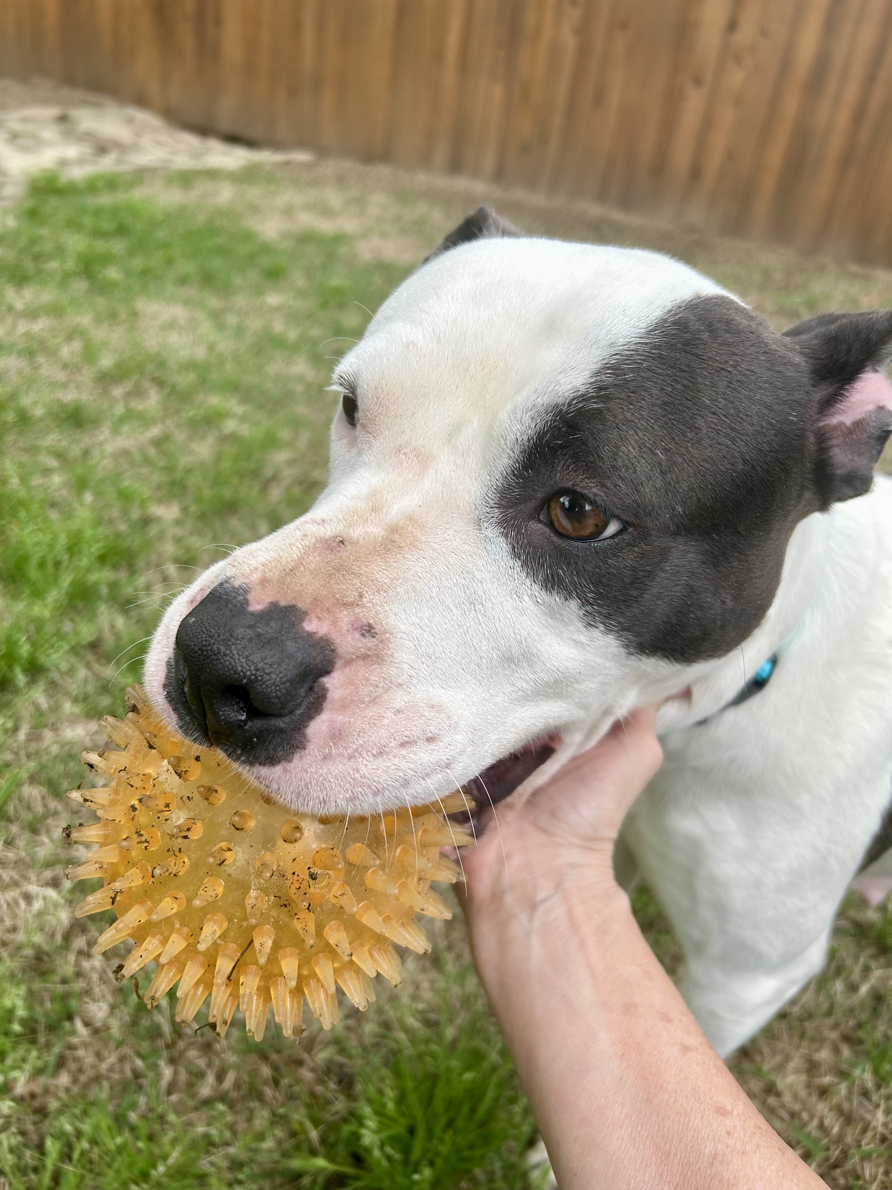 Meanwhile, Wishbone is doing great. Heβs 59 pounds now β so heβs gained 20 pounds since arriving! He is really the sweetest boy, winning every heart he meets with his gentle way. Heβs also doing great on a leash, solidly housebroken and crate-trained, and just a tiny bit quirky! He likes to eviscerate chew toys, and when heβs out of the crate, he moves his blankets out too. Maybe heβs expecting housecleaning?