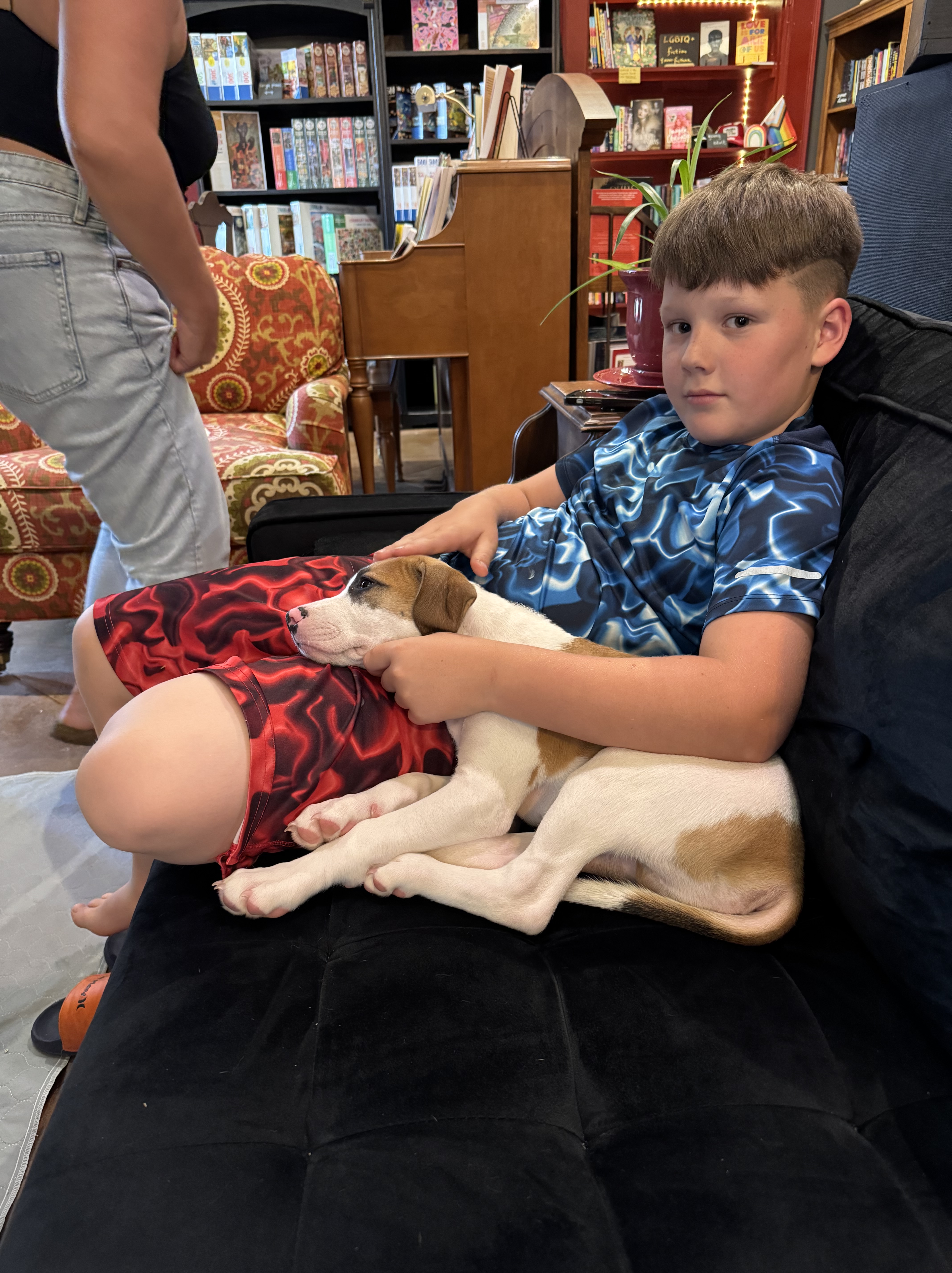 Green Bean is eleven weeks old and weighs 15 pounds. He is a joyful, outgoing puppy who loves people. Usually the life of the party, he also loves to snuggle. His favorite pastime is tackling his brother! He’s learning to sit for treats and doing really well using puppy pads indoors.