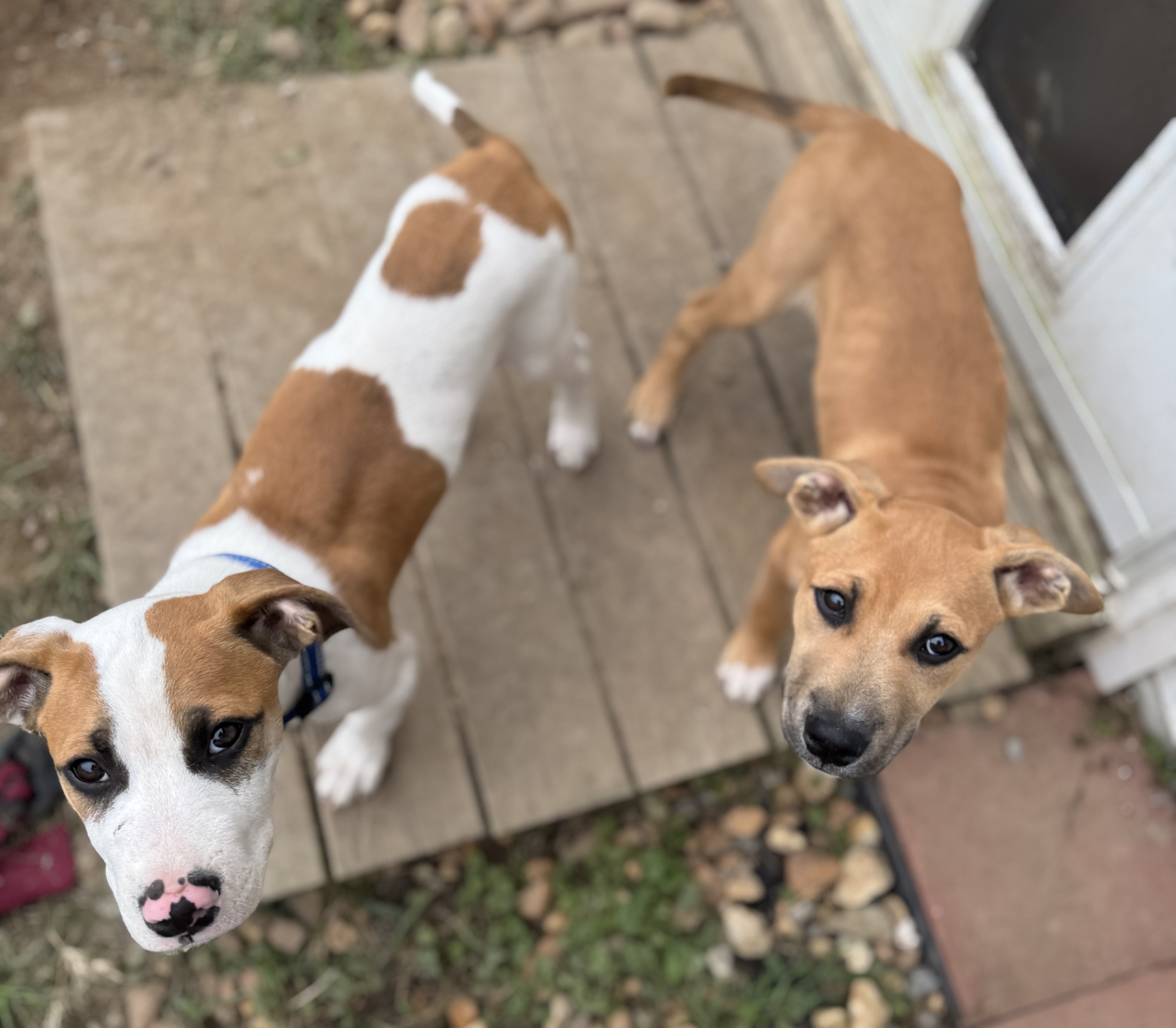 Both are crate-trained and doing awesome at house-training. Both are wanderers on the leash, but mostly stick close to me. Both are about 25 pounds and all legs at 4 months of age. I’m going to guess they will be 50-65 pounds, which is quite a span, but I’m terrible at that guessing game so I’m giving myself some buffer. Both are VERY treat-motivated so should be easy to train (they were easy to housebreak thanks to that quality).