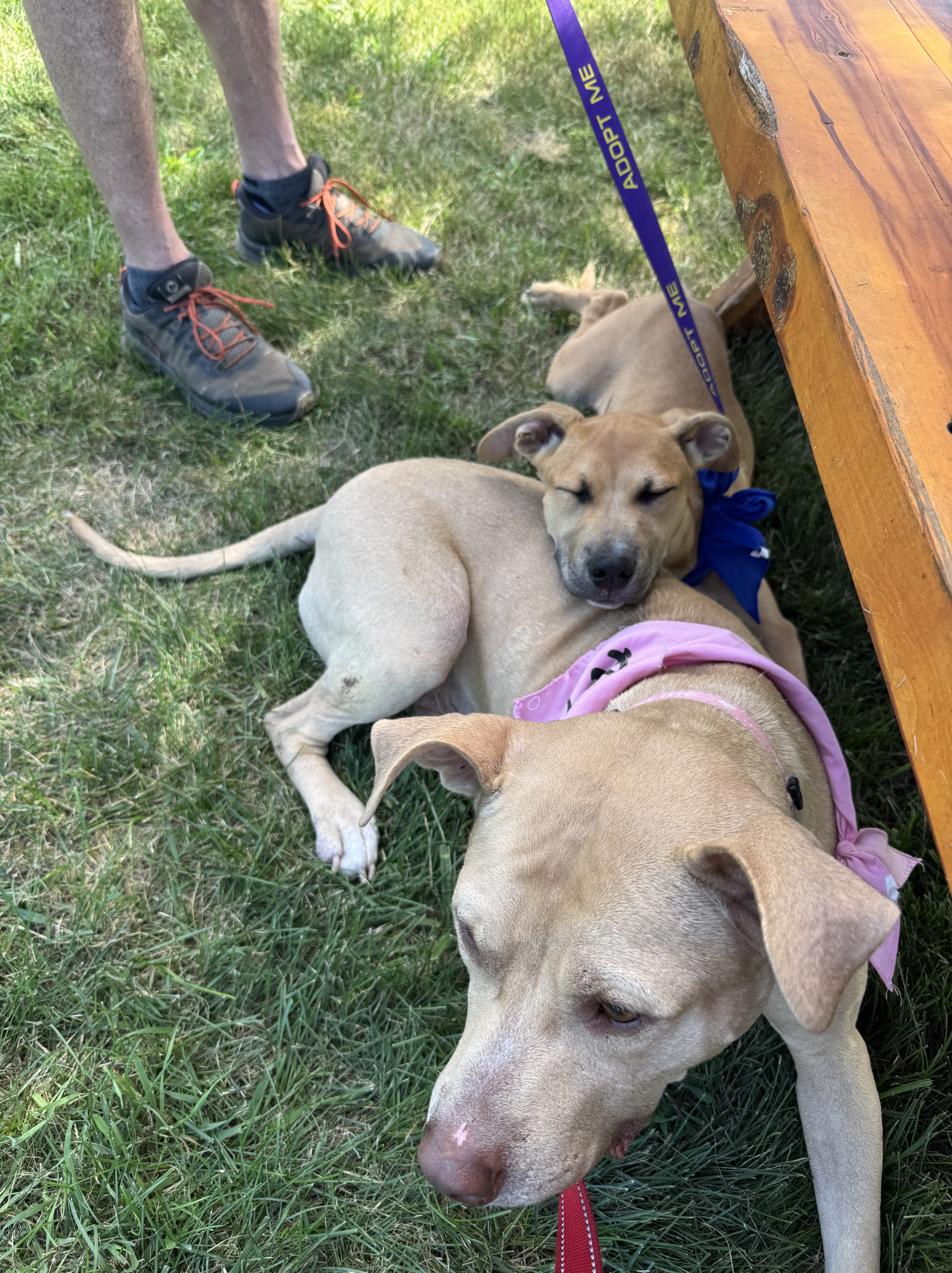 Both have been socialized with people of all ages, other dogs, and cats. They’ve been out for adoption events and done great. They travel well in the car, no longer getting carsick (like most puppies) and quiet on a tether or in a crate.
