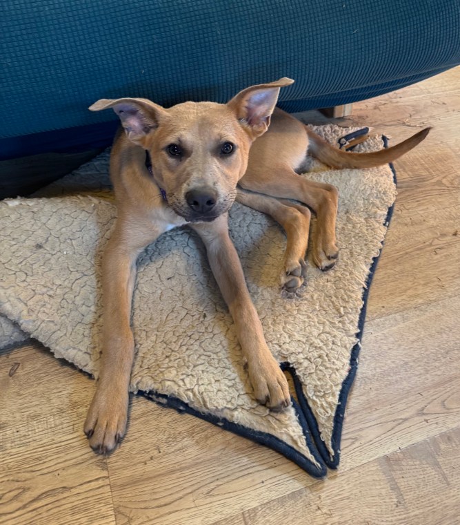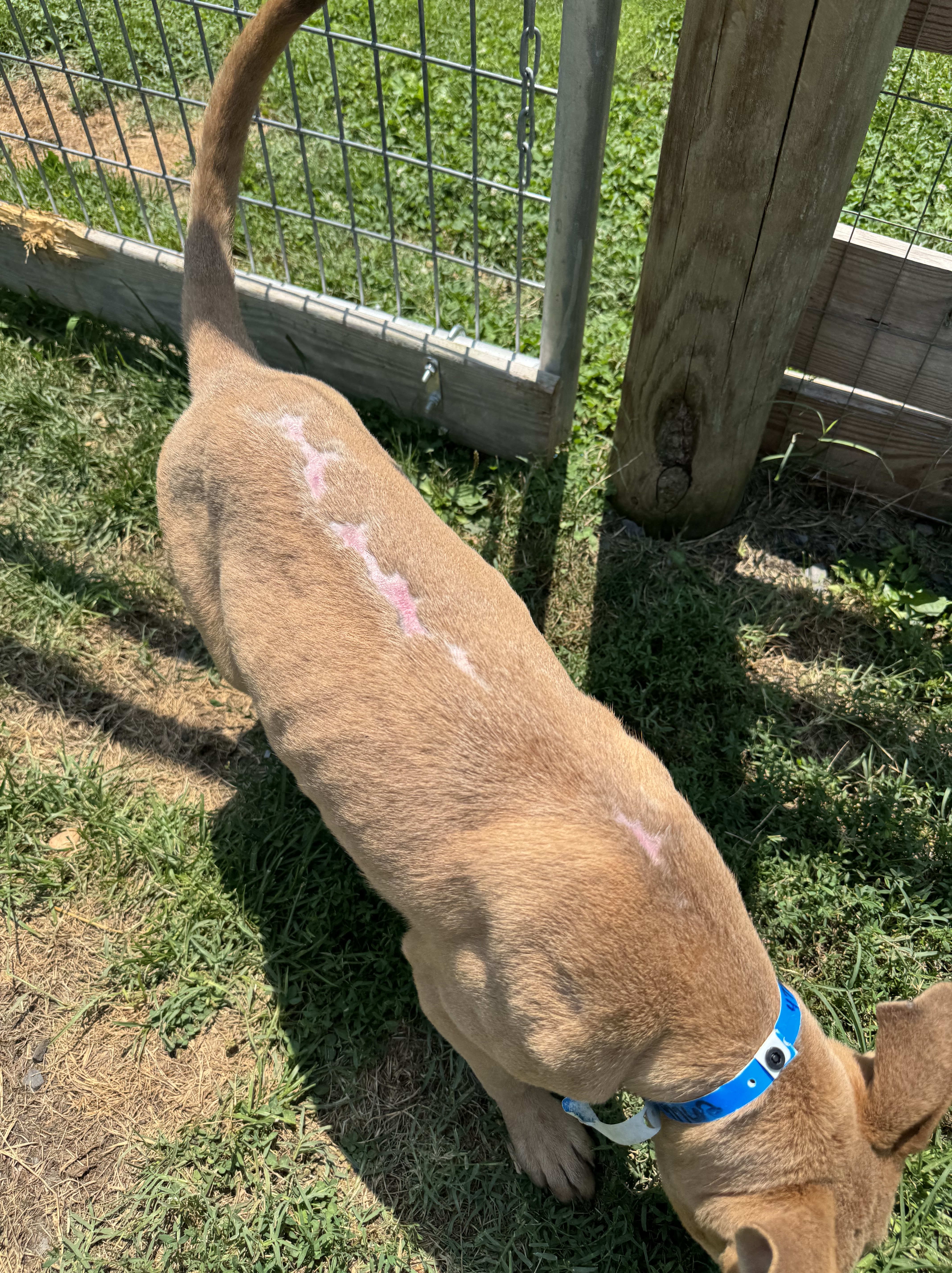 When he arrived, I said to Nick, βHe might be here a while.β He was squirrelly, pacing his crate, skinny, brown (really a taupe color) with a bright pink scar running the length of his back. But in the five weeks heβs been here, heβs gained a few pounds, the scar is nearly completely filled in with brown (and white!) hair, and heβs settled.