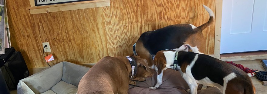 The puppies are one by one getting approved adopters. Being houndish puppies (my best guess, although I’m pretty sure there are probably a dozen different breeds in their DNA), they’ve required a few adjustments. Everyone is eating separately now to reduce the competitive eating urge and attempt to slow them down (adopters: you will want to purchase a slow-down or puzzle feeder!). We are also trying to get outside as much as possible, since clean up inside is a challenge as they grow and get more active.