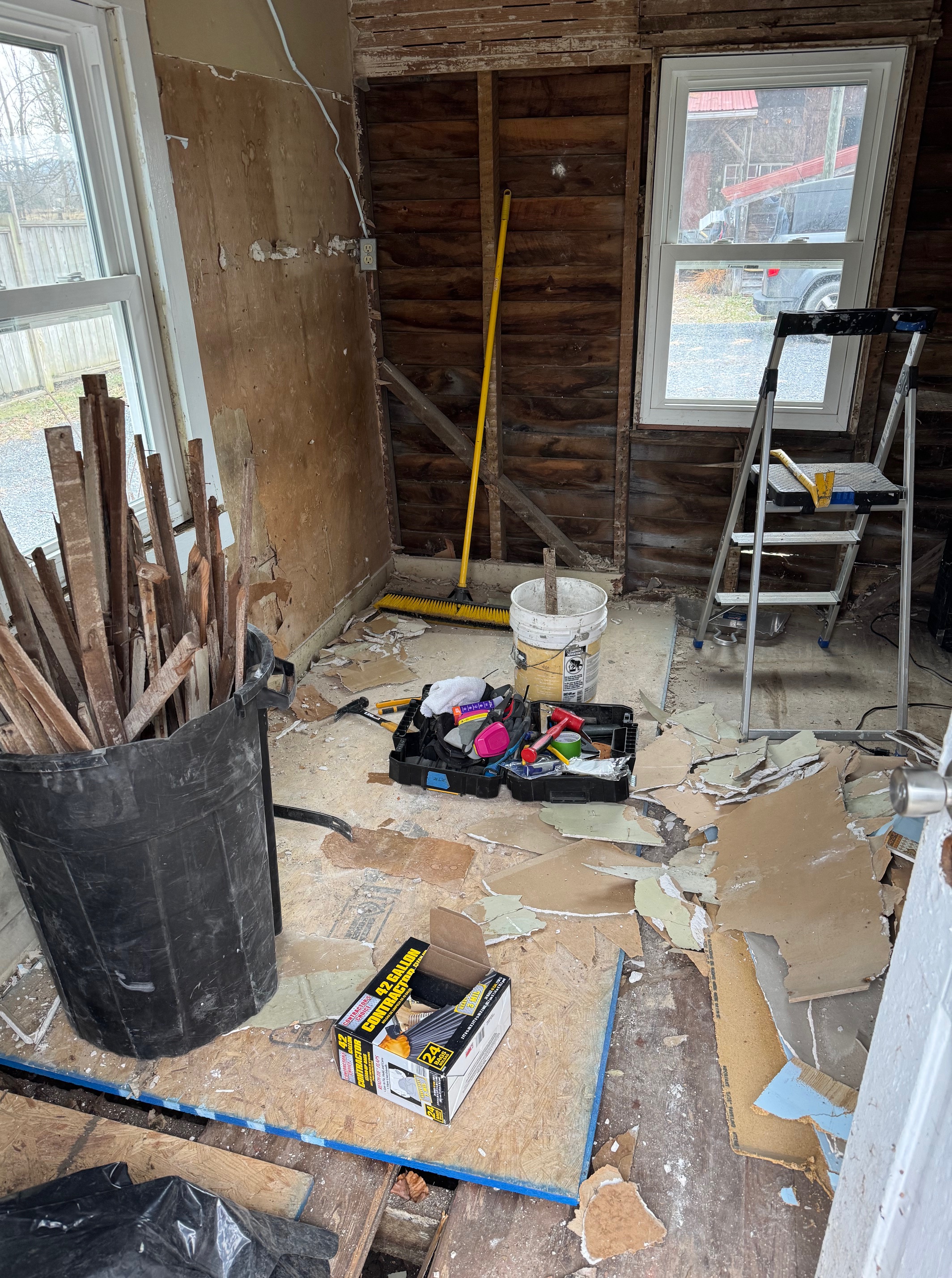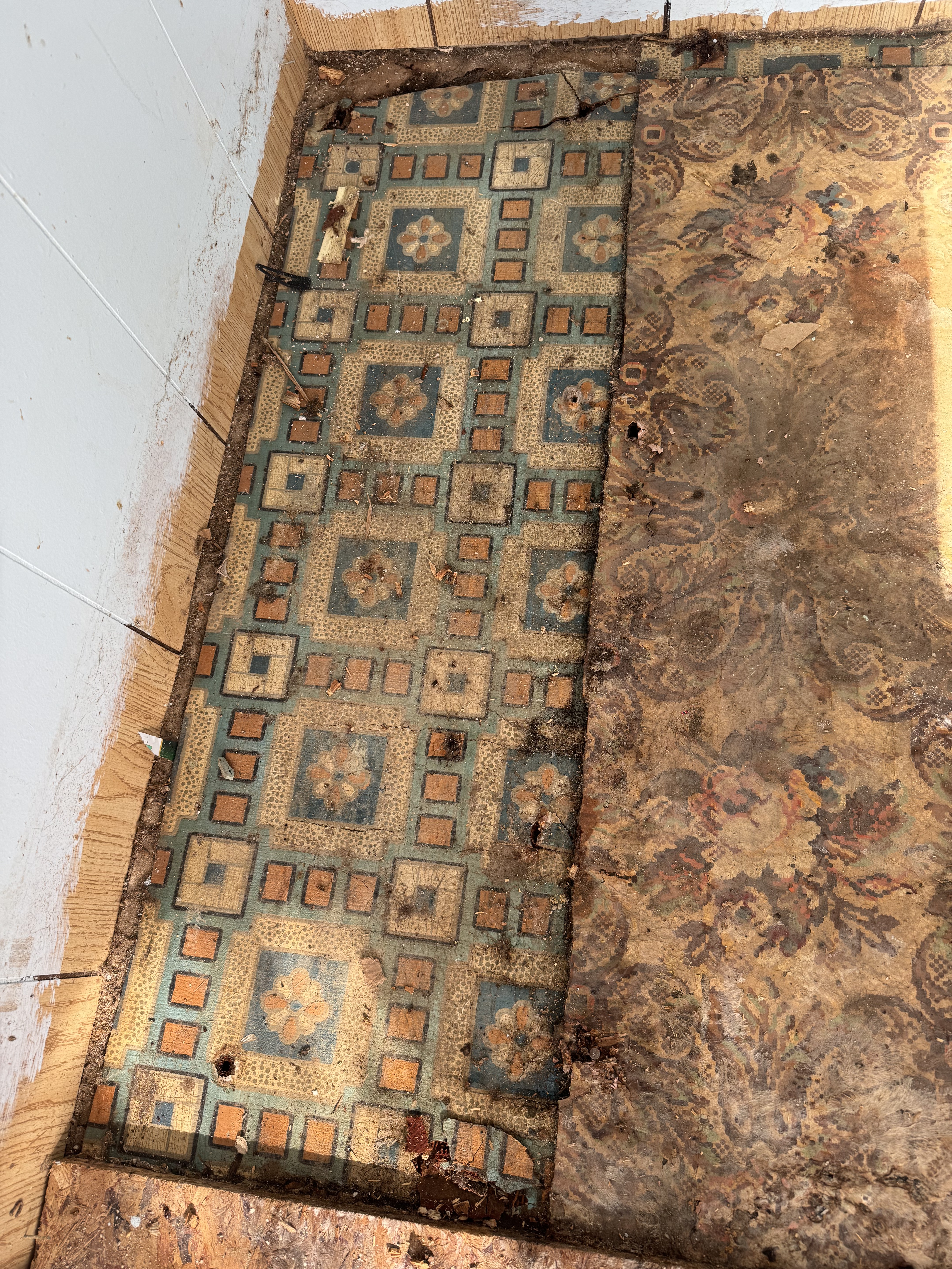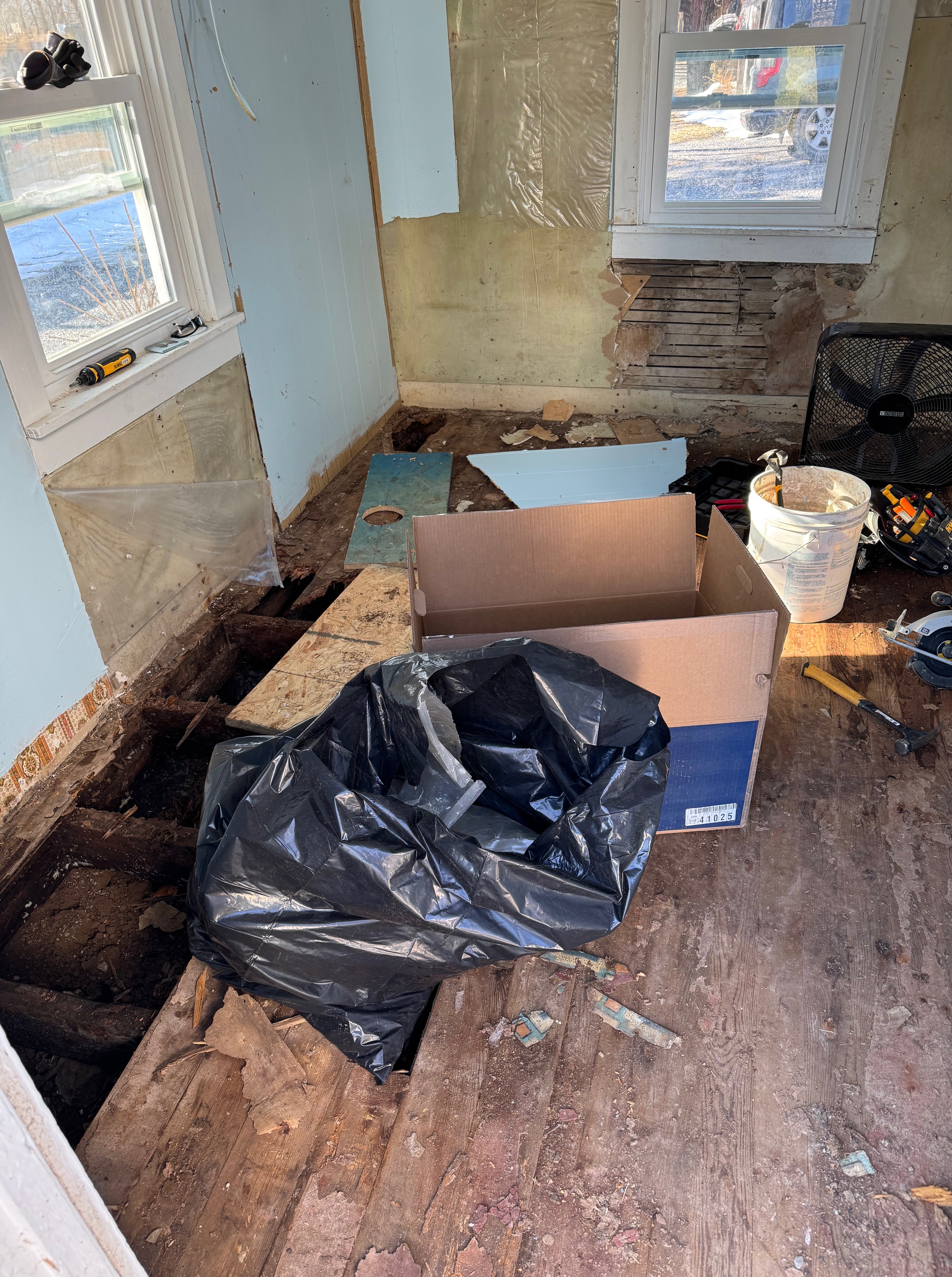 It wasn’t really a shock to discover what he’d done, what was a shock was to discover that the plywood beneath the vinyl was wet. Nick surveyed the mess, ripped up the vinyl, and then pulled up the plywood. Beneath that plywood was another layer of plywood, which was thoroughly soaked, and parts of it were covered in black mold. Beneath that layer of plywood, were two layers of linoleum, and beneath the linoleum was the original plank floor that dated back to when the cottage was built over a hundred years ago. Parts of the floor might be salvageable, but some of it was so rotten you could put your foot through it to the dirt beneath.