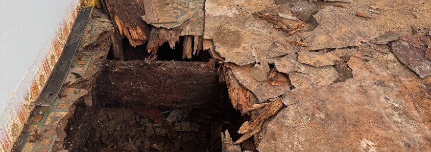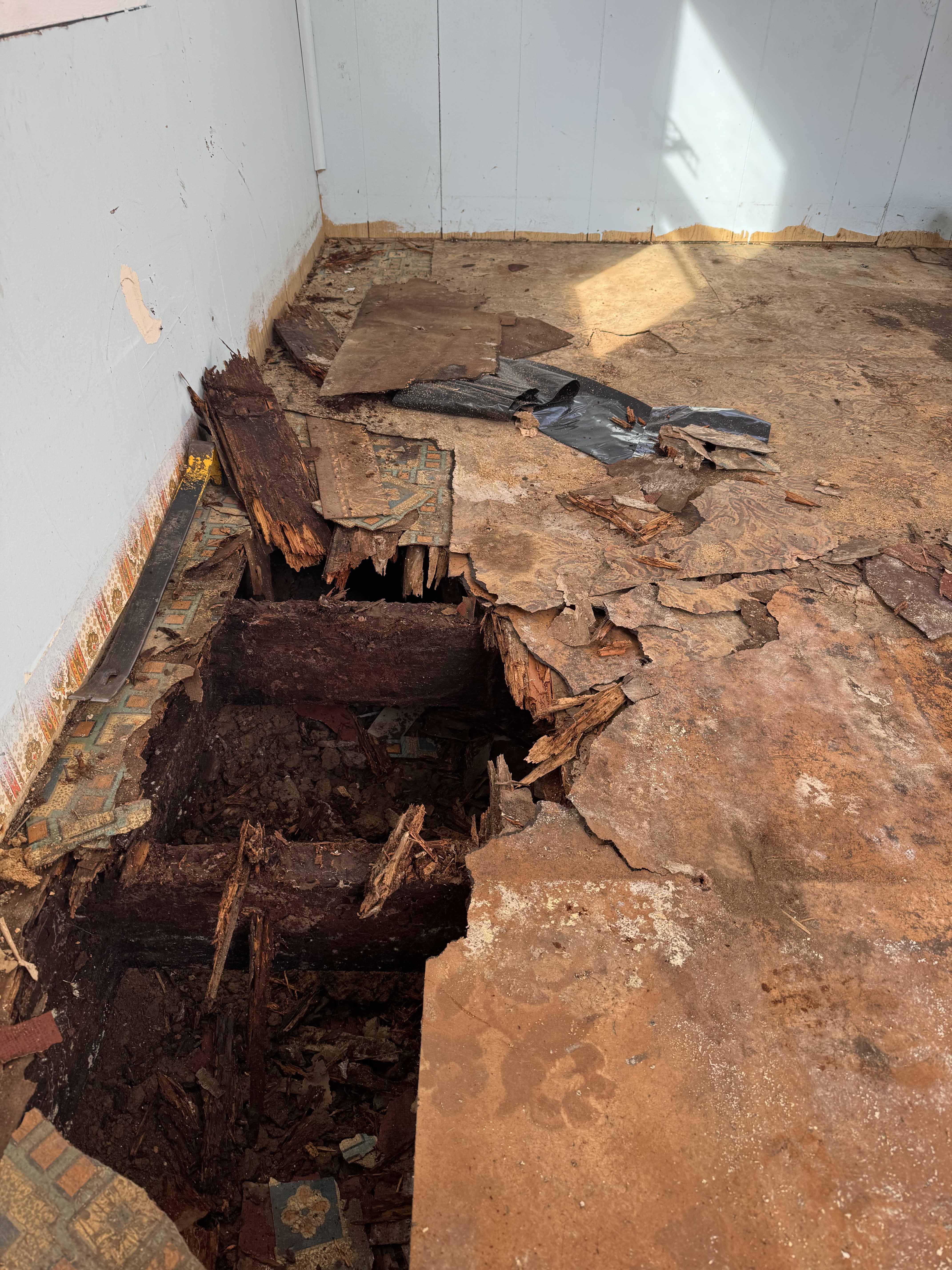 Seems the cottage has a history of occupants covering up one problem after another. Because no one thought to put any kind of ventilation in the crawlspace, the damp from the ground and any water that might have run beneath it (the ground is slanted slightly) simply seeped upward into the floor. It had also seeped upward on at least one wall.